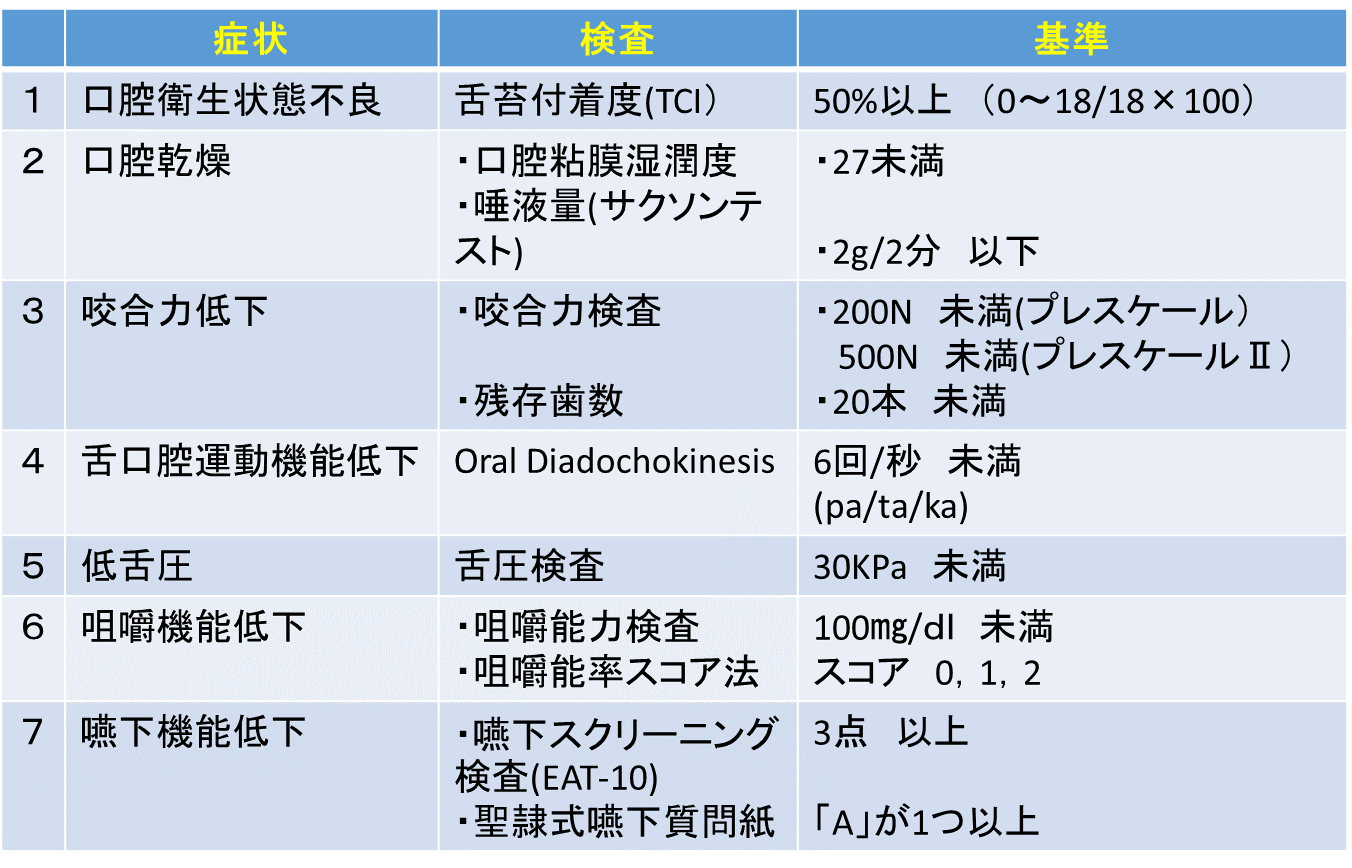 表1 口腔機能低下症の検査と基準(日本老年歯科医学会)
