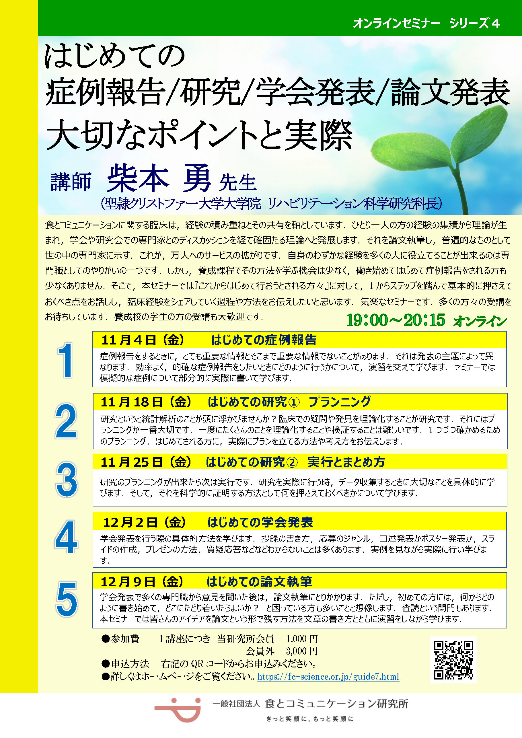 食とコミュニケーションに関する臨床は,経験の積み重ねとその共有を軸としています.ひとり一人の方の経験の集積から理論が生まれ,学会や研究会での専門家とのディスカッションを経て確固たる理論へと発展します.それを論文執筆し,普遍的なものとして世の中の専門家に示す.これが,万人へのサービスの拡がりです.自身のわずかな経験を多くの人に役立てることが出来るのは専門職としてのやりがいの一つです.しかし,養成課程でその方法を学ぶ機会は少なく,働き始めてはじめて症例報告をされる方も少なくありません.そこで,本セミナーでは『これからはじめて行おうとされる方々』に対して,1からステップを踏んで基本的に押さえておくべき点をお話しし,臨床経験をシェアしていく過程や方法をお伝えしたいと思います.気楽なセミナーです.多くの方々の受講をお待ちしています.養成校の学生の方の受講も大歓迎です.
