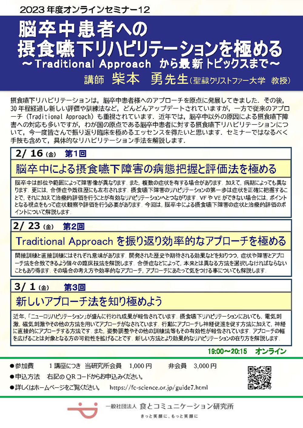摂食嚥下リハビリテーションは,脳卒中患者様へのアプローチを原点に発展してきました. その後,30 年程経過し新しい評価や訓練法など,どんどんアップデートされていますが,一方で従来のアプローチ(Traditional Approach)も重視されています. 近年では,脳卒中以外の原因による摂食嚥下障害への対応も多いですが,わが国の原点である脳卒中患者に対する摂食嚥下リハビリテーションについて,今一度皆さんで振り返り臨床を極めるエッセンスを得たいと思います. セミナーではなるべく手技も含めて,具体的なリハビリテーション手法を解説します.