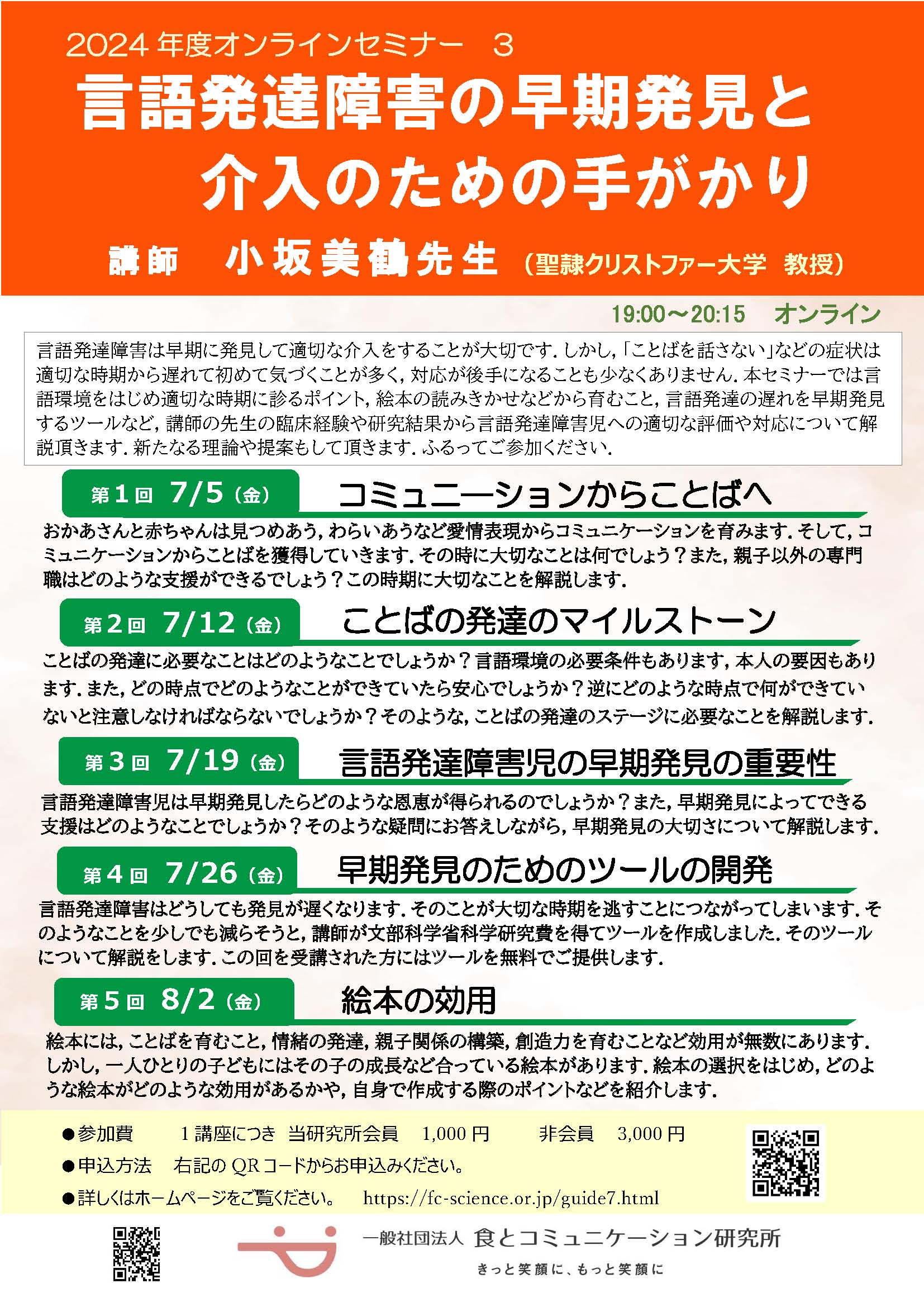 言語発達障害は早期に発見して適切な介入をすることが大切です.しかし,「ことばを話さない」などの症状は適切な時期から遅れて初めて気づくことが多く,対応が後手になることも少なくありません.本セミナーでは言語環境をはじめ適切な時期に診るポイント,絵本の読みきかせなどから育むこと,言語発達の遅れを早期発見するツールなど,講師の先生の臨床経験や研究結果から言語発達障害児への適切な評価や対応について解説頂きます.新たなる理論や提案もして頂きます.ふるってご参加ください.