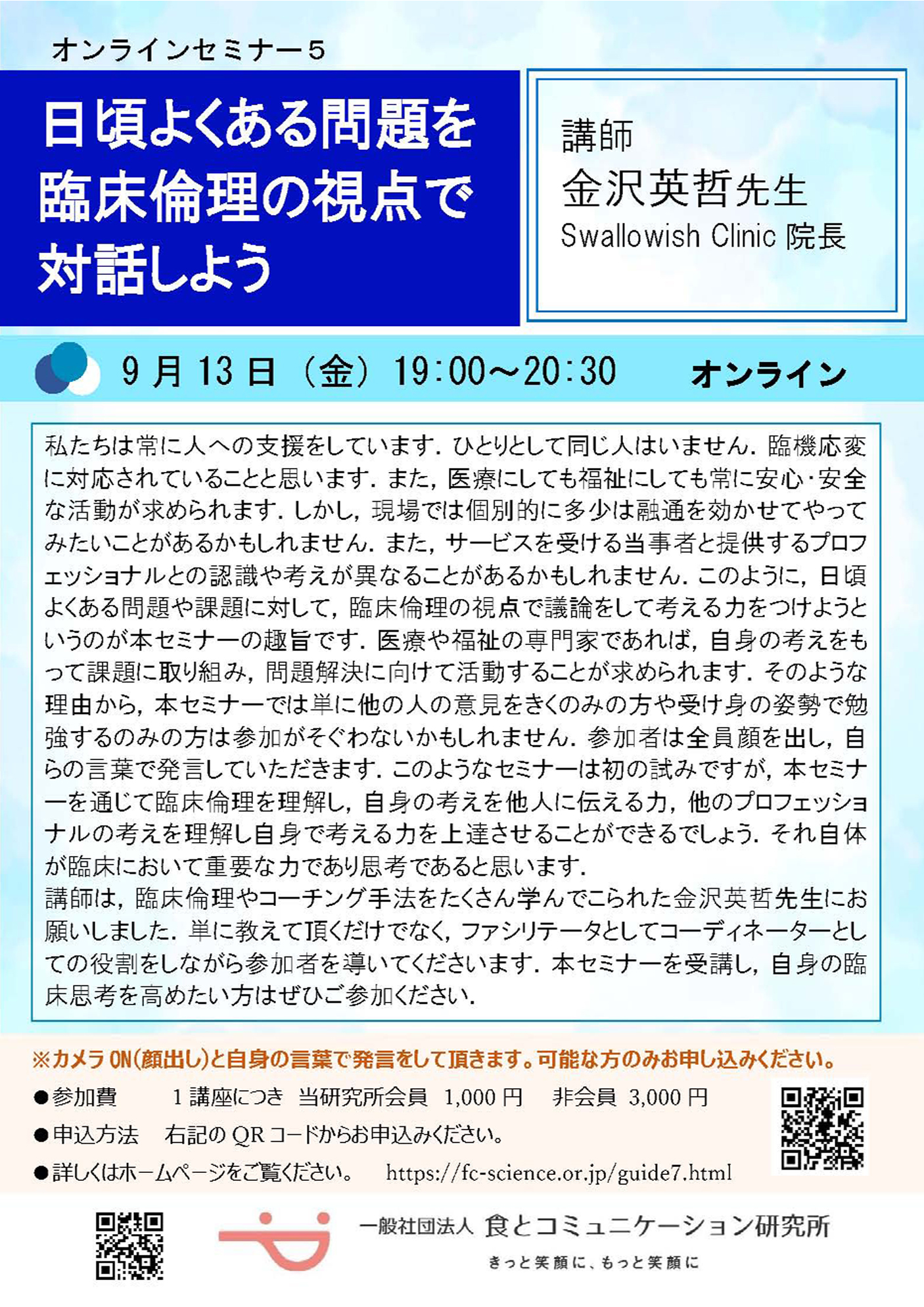 「日頃よくある問題を臨床倫理の視点で対話しよう」全1回