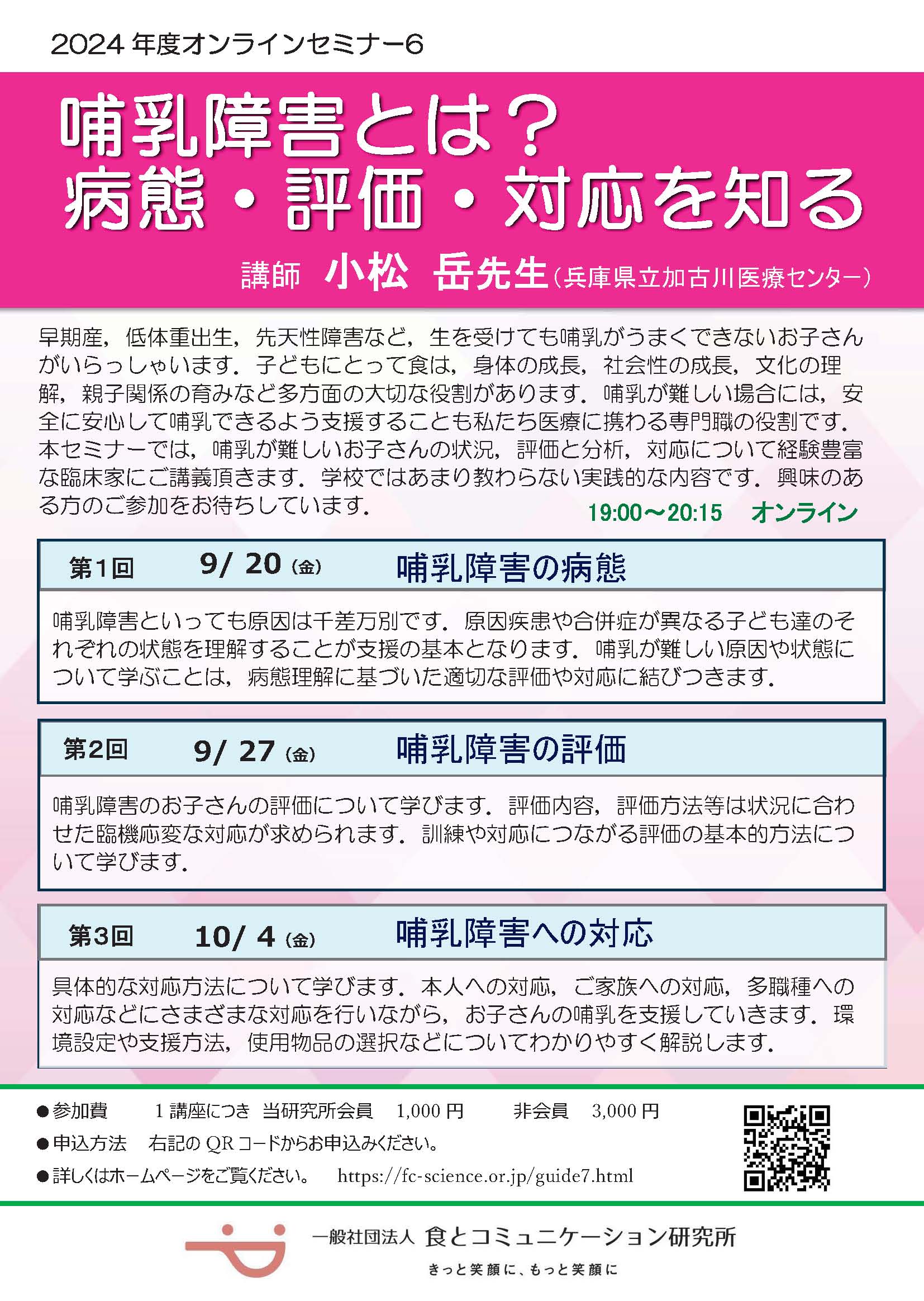 早期産,低体重出生,先天性障害など,生を受けても哺乳がうまくできないお子さんがいらっしゃいます.子どもにとって食は,身体の成長,社会性の成長,文化の理解,親子関係の育みなど多方面の大切な役割があります.哺乳が難しい場合には,安全に安心して哺乳できるよう支援することも私たち医療に携わる専門職の役割です.本セミナーでは,哺乳が難しいお子さんの状況,評価と分析,対応について経験豊富な臨床家にご講義頂きます.学校ではあまり教わらない実践的な内容です.興味のある方のご参加をお待ちしています.