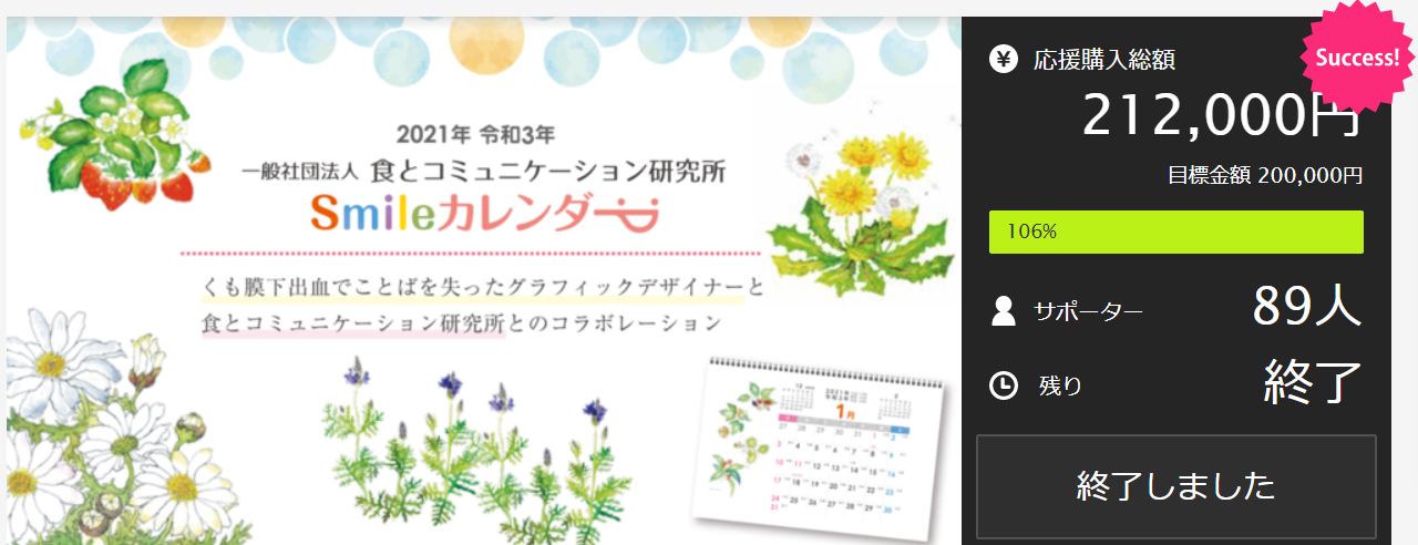 一般社団法人 食とコミュニケーション研究所では、ただいまクラウドファンディングに挑戦しています。 食やコミュニケーションの障がいとその方々の可能性をより正確に知って頂き、当事者の方への理解や可能性を理解して頂きたいと願っています。 カレンダーのイラストは、失語症の当事者である奥田秋穂さんが1枚1枚丁寧に描いてくださいました。クラウドファンディングでお預かりした資金を、イラストの原稿料やカレンダーの印刷費用などに充てさせていただきます。