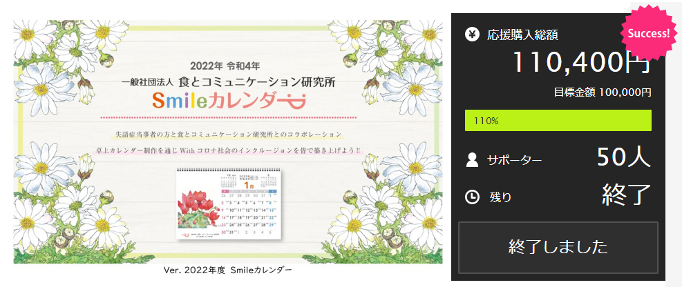 2021年度も「Smile カレンダー」プロジェクトを実施いたしました。プロジェクトは今回も失語症の当事者であられる奥田秋穂様と食とコミュニケーション研究所とが協働しました。その理由は、「失語症のことをもっともっと知って頂きたい」という想いからでした。プロジェクト開始初日には、『イラストをかかれている方の温かみや生命力が、絵から伝わってきて、こちらも元気をもらえそうです。言葉ではないからこそ、伝わるものもあるんですね。これからも頑張ってください、微力ながら応援します。』や『素敵で便利なカレンダーとポストカードです。お花は自然と笑顔になりますね。届くのを楽しみにしています。』のコメントを頂戴しました。また、2日目には『今年1年、奥田秋穂さんの素敵な挿絵のカレンダーと共に元気に過ごすことが出来ました。来年のカレンダーも心待ちにしておりました。ありがとうございます。』のコメントをお寄せいただき、ご本人も研究所スタッフもみなが笑顔になりました。