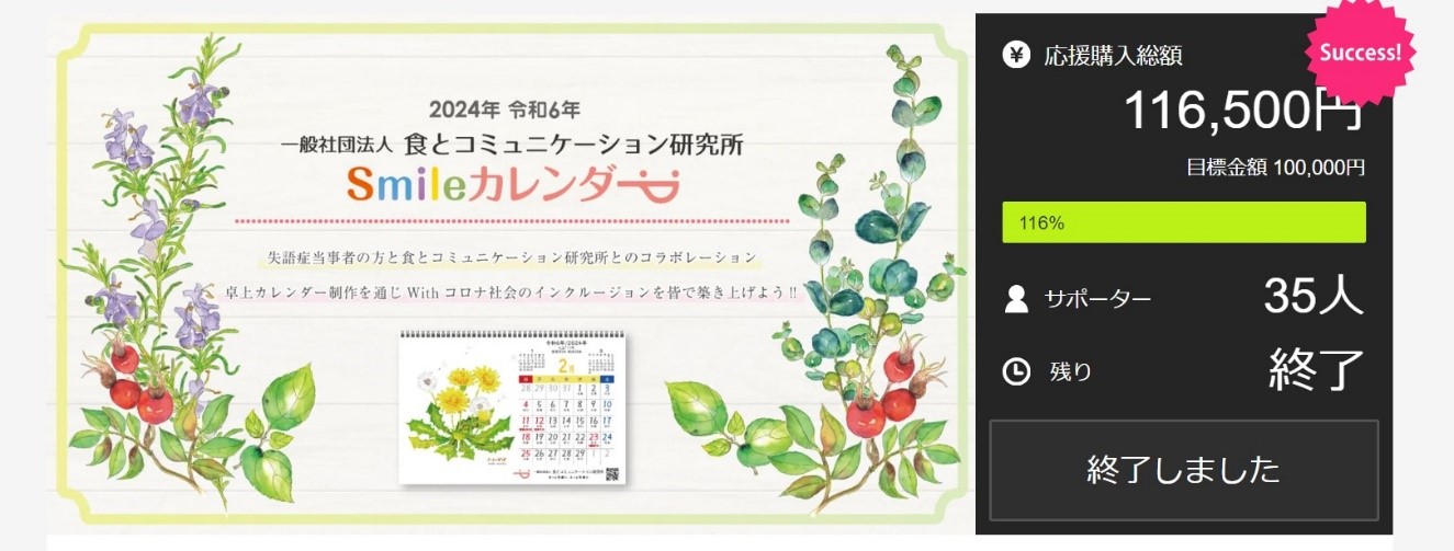 毎年恒例となってきた「Smile カレンダー」プロジェクトを実施いたしました。プロジェクトは失語症の当事者であられる奥田秋穂様と食とコミュニケーション研究所とがコラボレーションして実現しました。プロジェクトの願いは、「失語症のことをもっともっと知って頂きたい」ことでした。また、現代社会は『共生社会』、『インクルーシブ』、『ダイバーシティ』ということばで表せられるよう、自身が輝く場所で自分らしく活躍しそれを包み込むことが進められています。プロジェクトは、奥田様が自分らしい絵を描かれ研究所がそれを社会に見せるそのような役割分担をすることで、奥田様の才能を示すことができます。